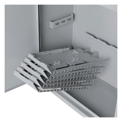 Складные кросс-модули, встроенные в блок, позволяют существенно уменьшить глубину шкафа при увеличении количества портов. Оптические кабели вставляются в шкаф через отверстия в верхней и нижней стенках, которые оснащены пылезащитными чехлами. В закрытом положении поперечные модули запираются один за другим. Каждый отдельный модуль можно снимать и проводить работы вне шкафа.