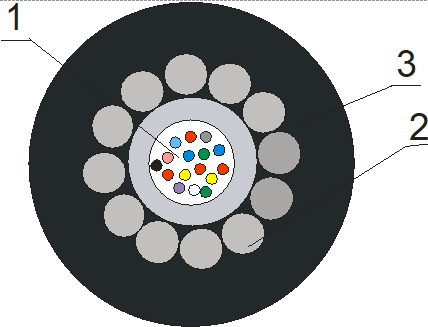 - оптические волокна одномодовые стандартные, соответствующие рекомендации G.652 (D), окрашенные; - гидрофобный заполнитель; - полибутилентерефталат; Оптический модуль выполнен в виде трубки из полиэтилентерефталата; 2. Бронепокров: - стальная оцинкованная проволока; - гидрофобный заполнитель; 3. Наружная оболочка из полиэтилена высокой плотности. |