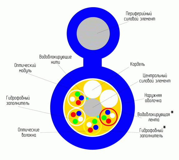 * Межмодульное пространство заполнено гидрофобным заполнителем или поверх скрученных оптических модулей и корделей наложена водоблокирующая лента.