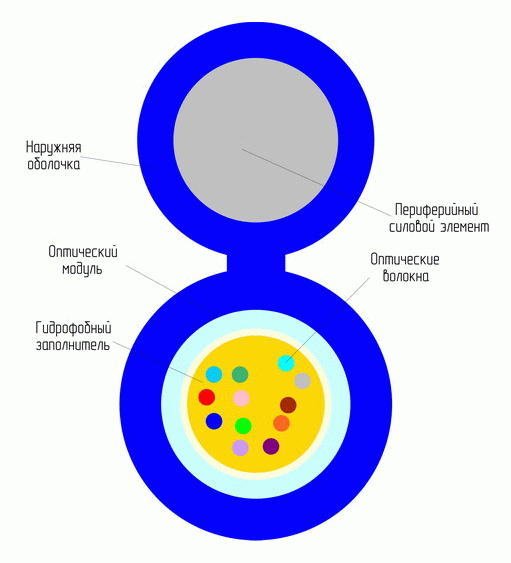 Свободное пространство в оптическом модуле заполнено гидрофобным заполнителем. В качестве периферийного силового элемента использован стальной трос или стеклопластиковый пруток.