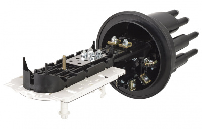 Способ герметизации вводов кабелей, осуществляется с помощью термоусаживаемых трубок ТУТ. Круглые патрубки на оголовнике муфты изначально герметичны и имеют ступенчатую форму с разными диаметрами. Срезая патрубок в определенном месте можно подобрать отверстие максимально близкое к диаметру вводимого кабеля. Таким образом, исключается излишнее натяжение ТУТ после усадки при вводе относительно тонких кабелей. Все патрубки муфты оснащены также индивидуальными узлами крепления ЦСЭ.