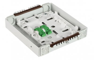Корпус изготовлен из металла и окрашен порошковой краской. Внутри корпуса находится пластмассовая вставка, на которой выкладывается запас волокон пигтейлов, размещаются ложементы для КДЗС и оптические адаптеры для подключения входных разъемов сплиттерных модулей. Зона монтажа ОВ закрывается металлической крышкой к которой крепятся сплиттерные модули. Для ограничения доступа оснащаются винтом-секреткой.
