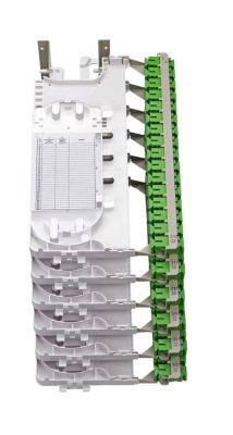 Конструктивной особенностью данного решения является монтаж и кросс-коммутация ОВ в откидных кроссовых модулях, объединенных в кроссовые блоки. Каждый модуль содержит кассету для укладки ОВ и панель с адаптерами (до 24 FC или 32 SC). В собранном состоянии модули размещаются в блоке вертикально, при этом адаптерные панели образуют кроссовое поле. При повороте модуля в горизонтальное положение обеспечивается удобный доступ к адаптерам и пигтейлам. Для монтажа модуль свободно снимается с блока за счет запаса длины транспортных трубок.