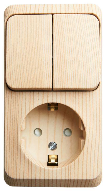 Блок ЭТЮД (сосна, открытой установки) предназначен для применения в сетях до 250В, состоит из розетки на 16А с заземлением и шторками и двухклавишного выключателя на 10А. Две клавиши позволяют управлять двумя источниками света с одной точки. Он удобен в применении и отлично подходит для коридора. Изделия цвета Сосна обладают уникальным рисунком, напоминающим древесный сруб. Сделано в России.
