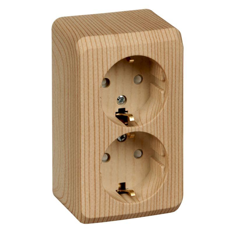 Розетка ЭТЮД (сосна, открытой установки) двухместная с заземлением и шторками предназначена для применения в сетях до 250В, на ток до 16А. Двухместная розетка позволяет подключить два устройства в одном месте. Шторки и заземление обеспечивают дополнительную безопасность при косвенных прикосновениях. Изделия цвета Сосна обладают уникальным рисунком, напоминающим древесный сруб. Сделано в России.