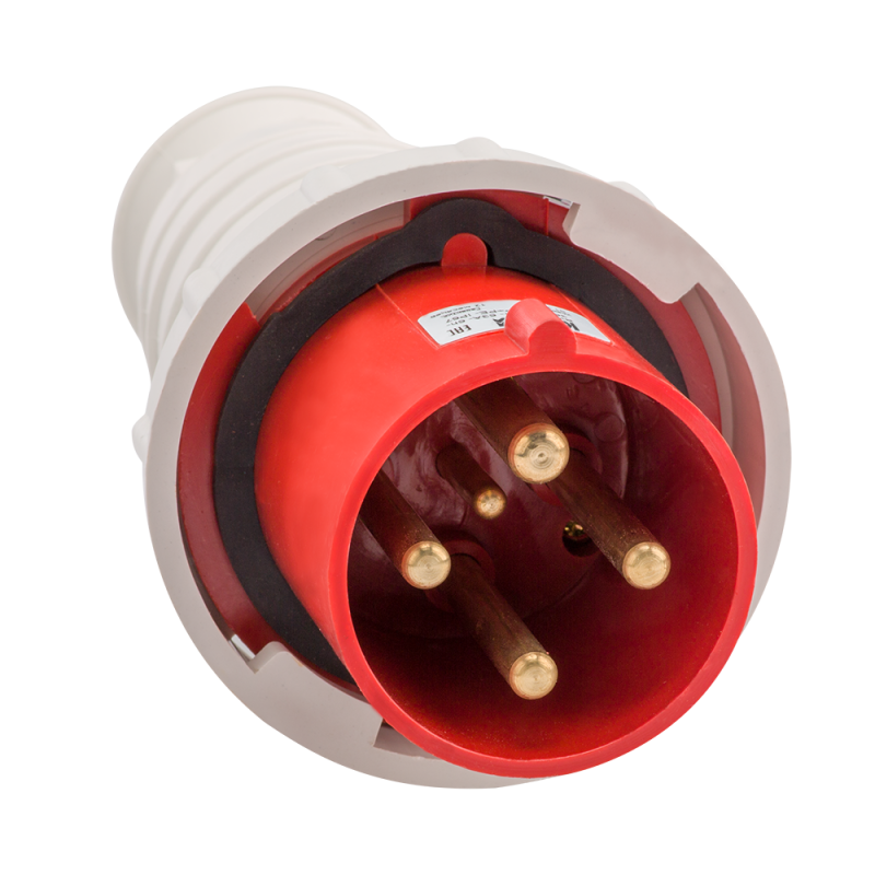 Силовая вилка 4 полюсная на номинальный ток 63 А и рабочее напряжение переменного тока 380 В.